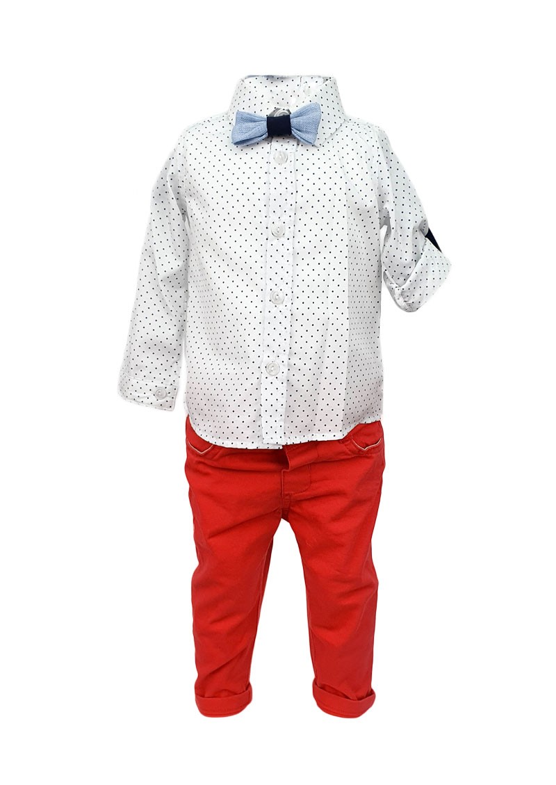 Compleu copii trendy, din bumbac, elegant-casual, pentru baieti. Este alcatuit din patru piese, vesta, camasa cu maneca lunga, papion si pantaloni. Vesta este de culoare albastra. Se incheie cu trei nasturi. Camasa de culoare alba este din bumbac, are maneca lunga, se incheie cu nasturi si este cu buline. Pantalonii, sunt din bumbac si sunt prevazuti cu elastic in talie. Papionul cu elastic este asortat la tinuta. Un model trendy potrivit pentru o tinuta lejera.