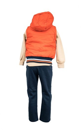 Compleul Moline Grands este un element de imbracaminte din bumbac, format din trei parti: vesta, bluza cu maneca lunga si pantalon. Bluza de culoare crem este cu imprimeu pe fata, are bata elastica la maneci si este cu polar pe interior. Vesta vatuita din fas de culoare portocalie se incheie cu fermoar are bata elastica, este prevazuta cu gluga si buzunare laterale. Interiorul vestei este captusit cu polar. Pantalonii de culoare bleumarin, sunt prevazuti cu doua buzunare laterale, elastic, sunt imprimati pe un picior, iar pe interior sunt cu polar. Compleul Molin Grands va asigura aspectul casual sport de care ai nevoie in perioada rece.