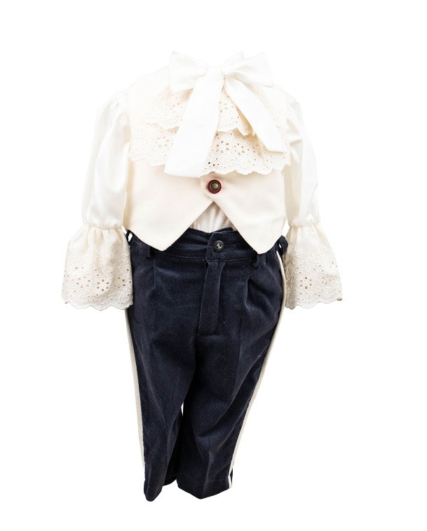 Costumul de botez model Prince este confectionat din bumbac si este compus din cinci piese ce confera o tinuta aristocrata: redingota, pantaloni, camasa, vesta si bascuta, toate perfect asortate. Redingota si bascuta sunt de culoare rosie, camasa alba din bumbac este inobilata cu dantela, vesta are nasturi asortati cu redingota, pantalonii sunt de culoare bleumarin. Are un aspect deosebit ce te intoarce cu gandul in perioada balurilor grandioase. Pentru o imbracare facila pantalonii sunt prevazuti cu elastic in talie iar camasa se incheie cu nasturi in partea din spate. Costumul este confectionat doar din materiale de calitate pentru confortul bebelusului. Costumul Prince este cu adevarat un model deosebit.