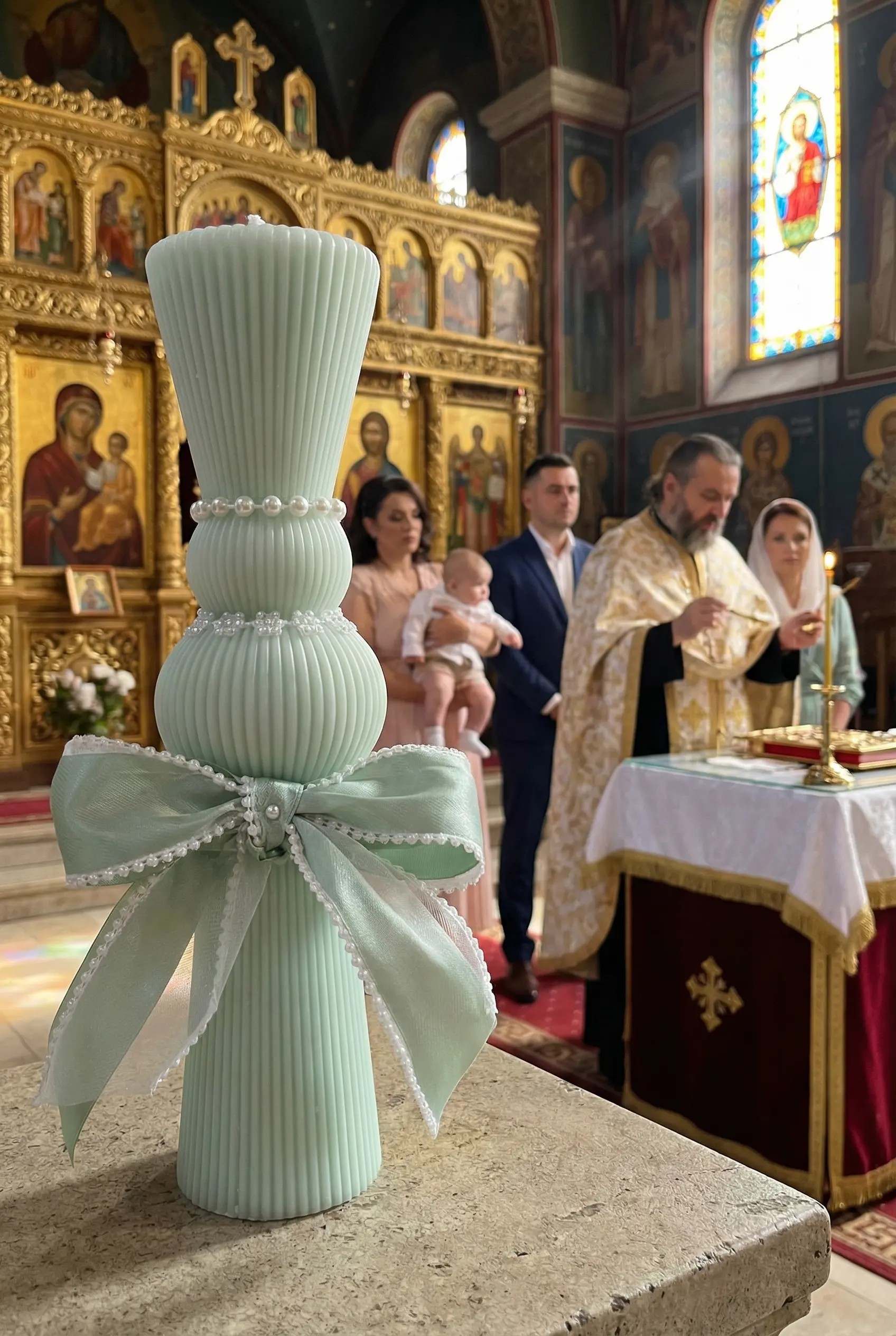 Lumanare botez fetite-baieti, model Clepsidra, culoare verde creata manual. Lumanare botez este din parafina verde cu o lungime de 26 cm si un diametru de 6.5 cm. Lumanarile sunt intarite pentru rezistenta la transport.