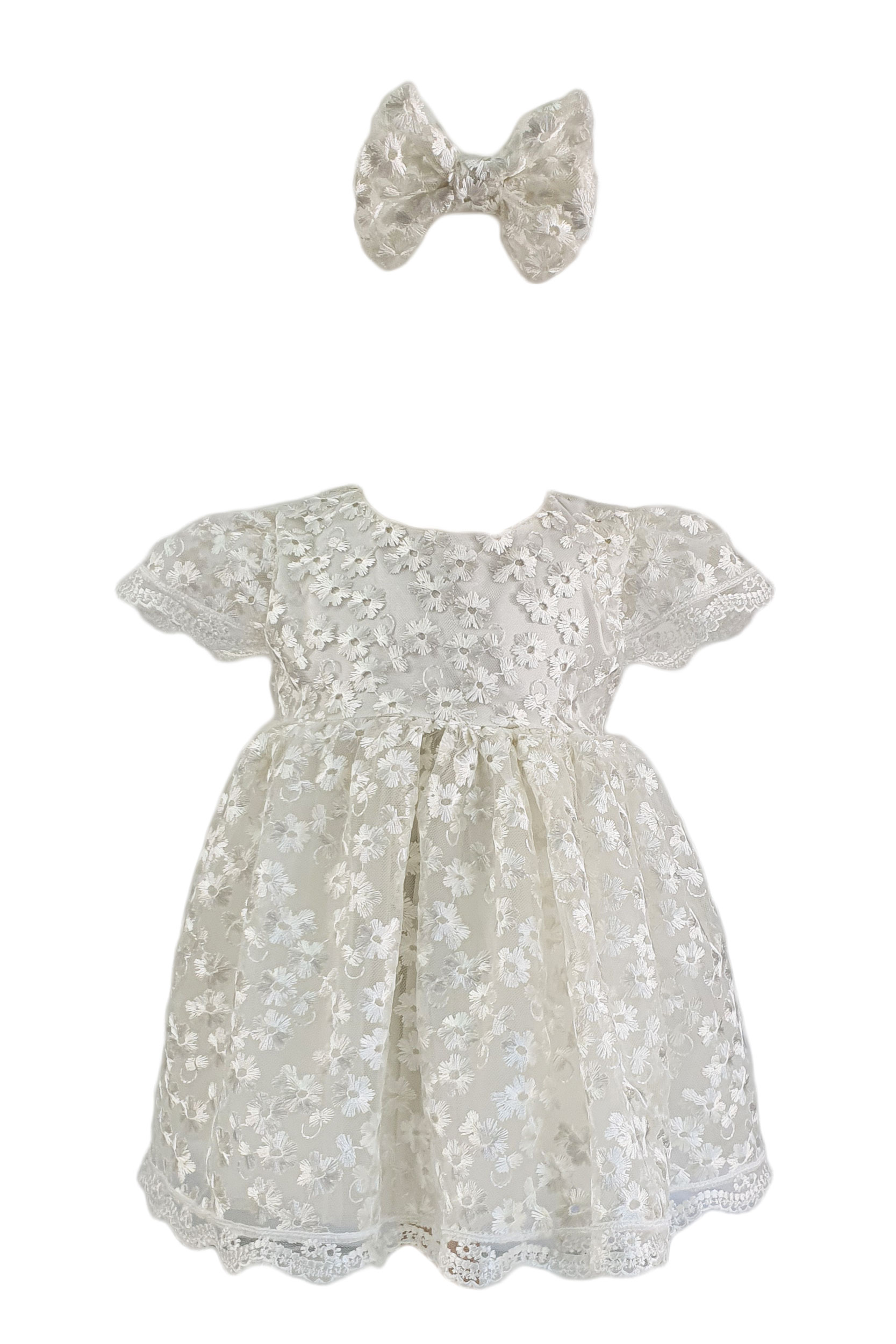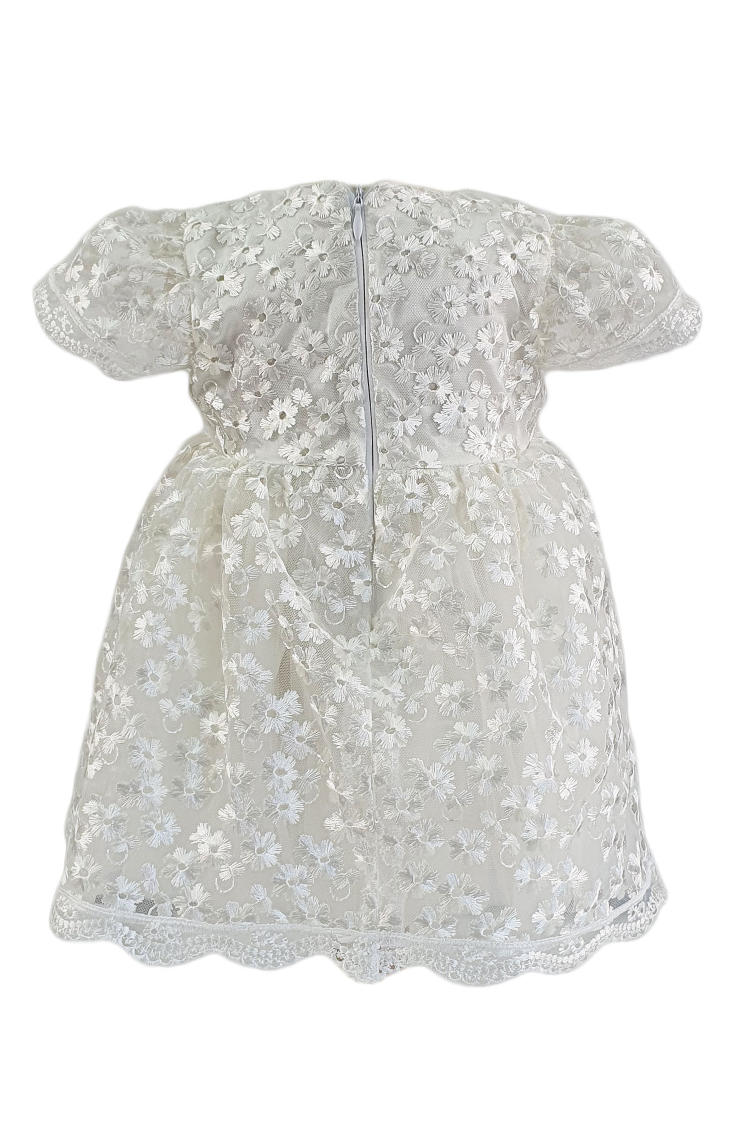 Rochie botez, model Rozelia, din dantela. Modelul de rochita botez este alcatuit din 2 piese: bentita si rochie. Este confectionata din dantela. Interiorul rochiei este din bumbac pentru oferirea confortului necesar la contactul cu pielea.