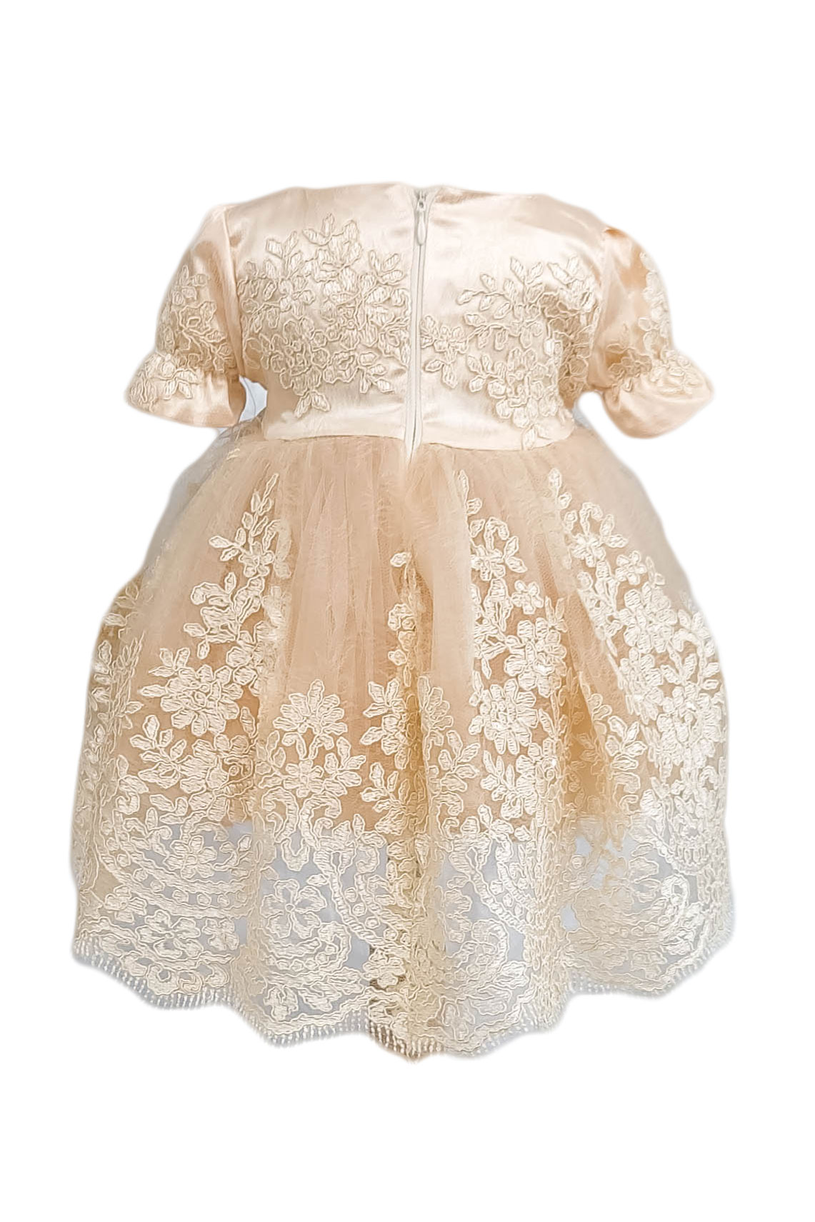Rochita botez model Mica Printesa, culoare crem. Rochia cu maneca scurta are bentita asortata. Este confectionata din dantela cu bumbac. Interiorul rochiei este din bumbac pentru oferirea confortului necesar. Bentita elastica este asortata. Cele 2 piese sunt perfect asortate. Un model deosebit potrivit atat pentru tinute elegante cat si casual. Pentru o imbracare facila rochia se inchei in partea din spate cu fermoar. Rochia este confectionata dintr-un material moale, placut la atingere si prietenos cu pielea. Rochita botez model Mica Printesa, culoare crem, un model trendy ce te va pune in evidenda la botez. Produs fabricat in Romania.