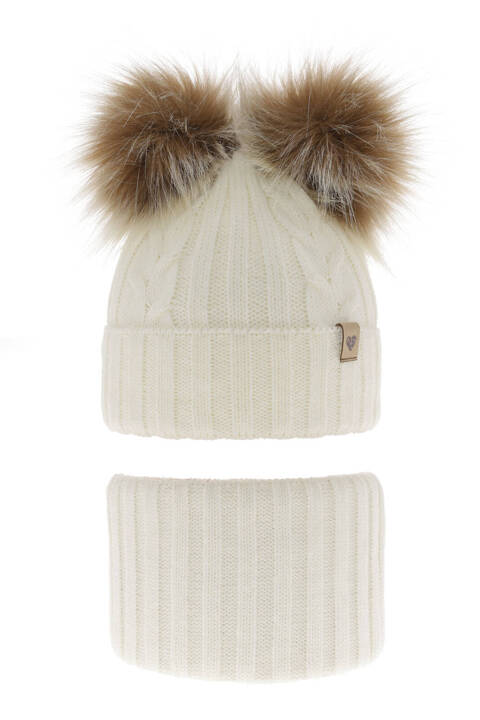 Set de iarna pentru fete caciula si fular circular cu 2 pompoane, model Amala, culoare ivoire. Caciulile noastre sunt elastice și se întind în medie cu 2 cm peste circumferința declarată a capului, astfel încât se vor potrivi întotdeauna perfect.