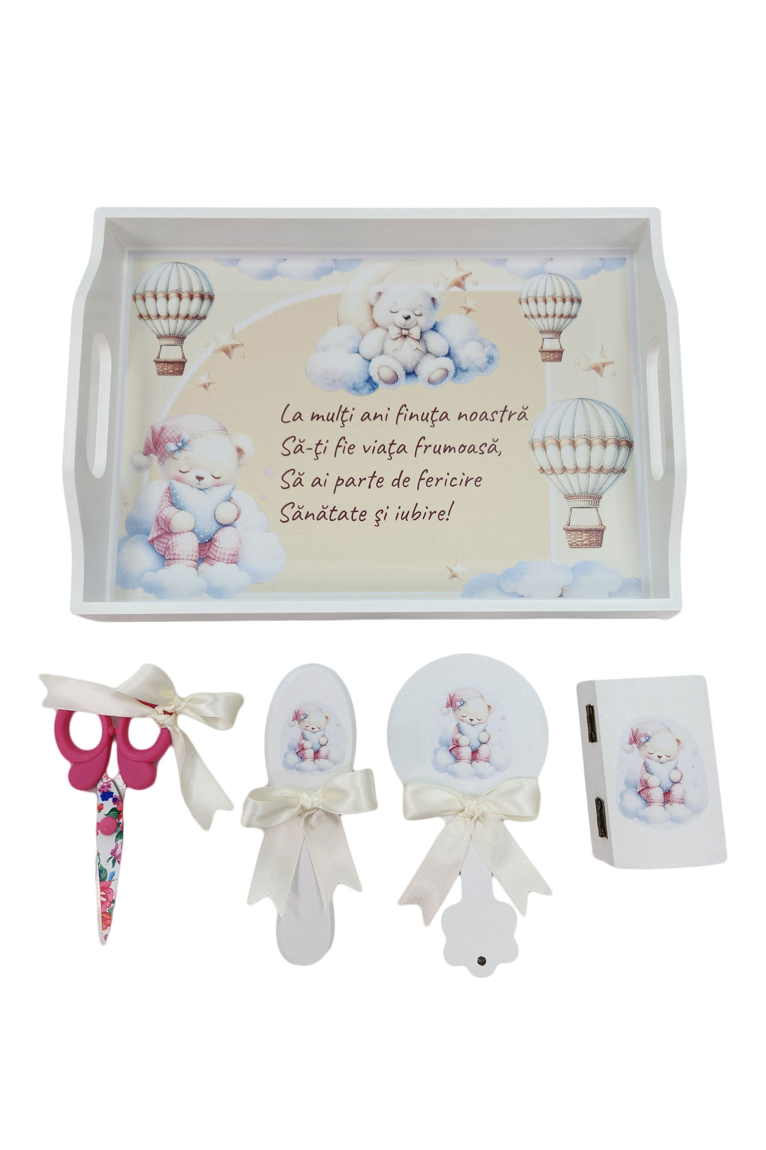 Tavita mot copii, 5 piese, model Vise, culoare galbena. Set taiere mot, 5 piese, model Vise, culoare galbena. Set din lemn pentru taiere mot. Are accesoriile potrivite evenimentului. Setul este format din: tava cu imprimeu viu colorat si cu mesaj, oglinda, perie de par, cutie, foarfec. Toate accesoriile sunt asortate. Set taiere mot, 5 piese, model Vise, culoare galbena, poate fi un cadou din partea nasilor la taierea motului.