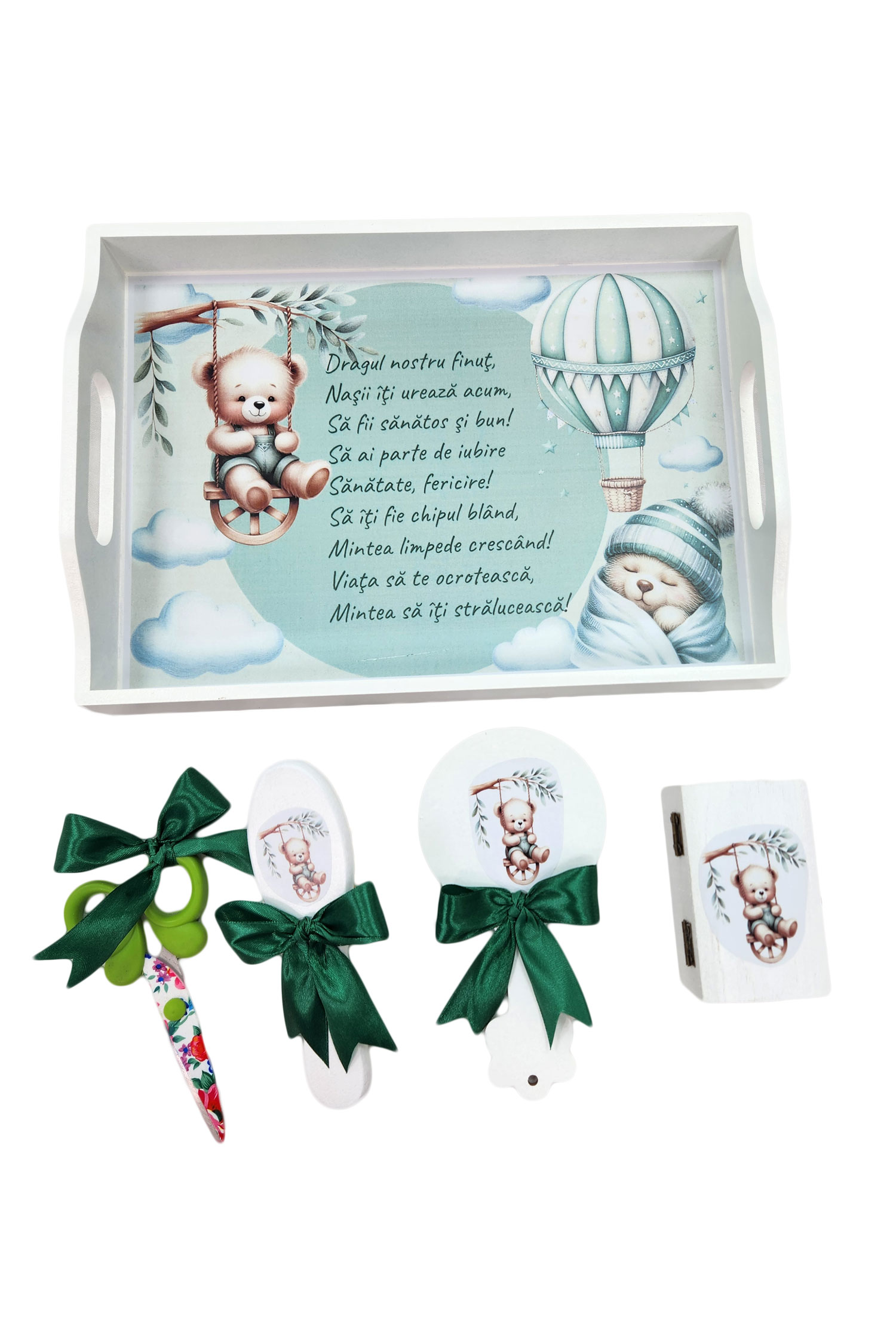 Tavita mot copii, 5 piese, model Vise, culoare verde. Set taiere mot, 5 piese, model Vise, culoare verdet. Set din lemn pentru taiere mot. Are accesoriile potrivite evenimentului. Setul este format din: tava cu imprimeu viu colorat si cu mesaj, oglinda, perie de par, cutie, foarfec. Toate accesoriile sunt asortate. Set taiere mot, 5 piese, model Vise, culoare verde, poate fi un cadou din partea nasilor la taierea motului.