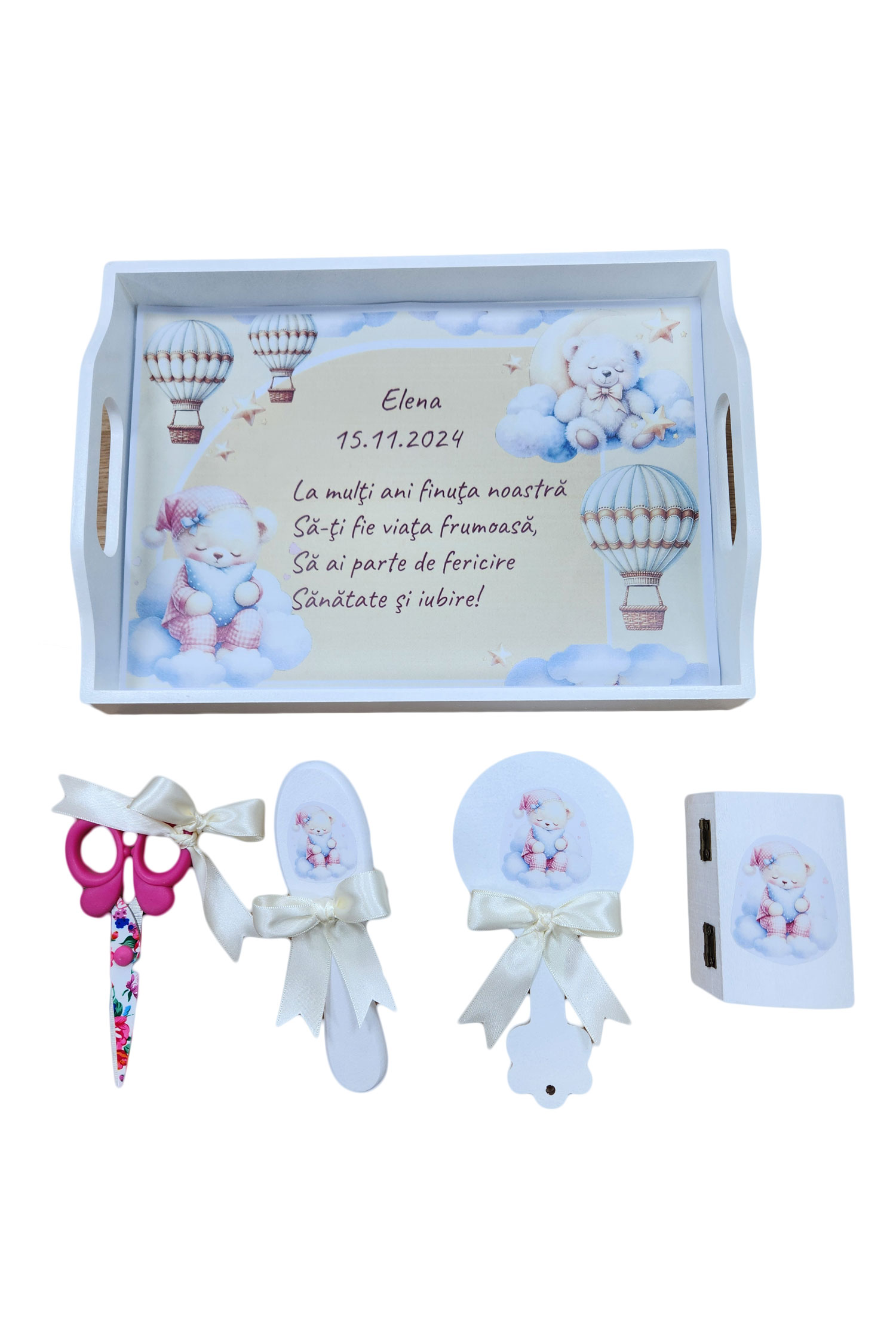 Tavita mot personalizat, 5 piese, model Vise, culoare galbena. Set taiere mot personalizat, 5 piese, model Vise, culoare galbena, pentru copilul tau. Set taiere mot din lemn pentru copii. Are accesoriile potrivite evenimentului. Setul este format din: tava cu imprimeu viu colorat si cu mesaj, oglinda, perie de par, cutie, foarfec. Toate accesoriile sunt asortate. Set taiere mot personalizat, 5 piese, model Vise, culoare galbena, poate fi un cadou din partea nasilor la taierea motului.
