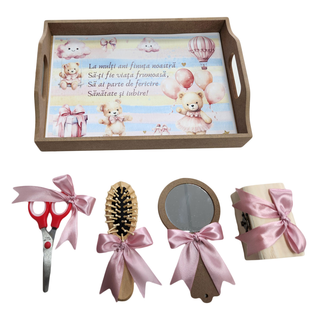 Tava mot fete, 5 piese, Ursulet cu Baloane. Set taiere mot cinci piese, pentru copilul tau. Set din lemn natur pentru copii. Are accesoriile potrivite evenimentului. Setul este format din: tava cu imprimeu viu colorat si cu mesaj, oglinda, perie de par, cutie, foarfec. Toate accesoriile sunt asortate. Tava mot fete, 5 piese, Ursulet cu Baloane poate fi un cadou din partea nasilor la taierea motului.
