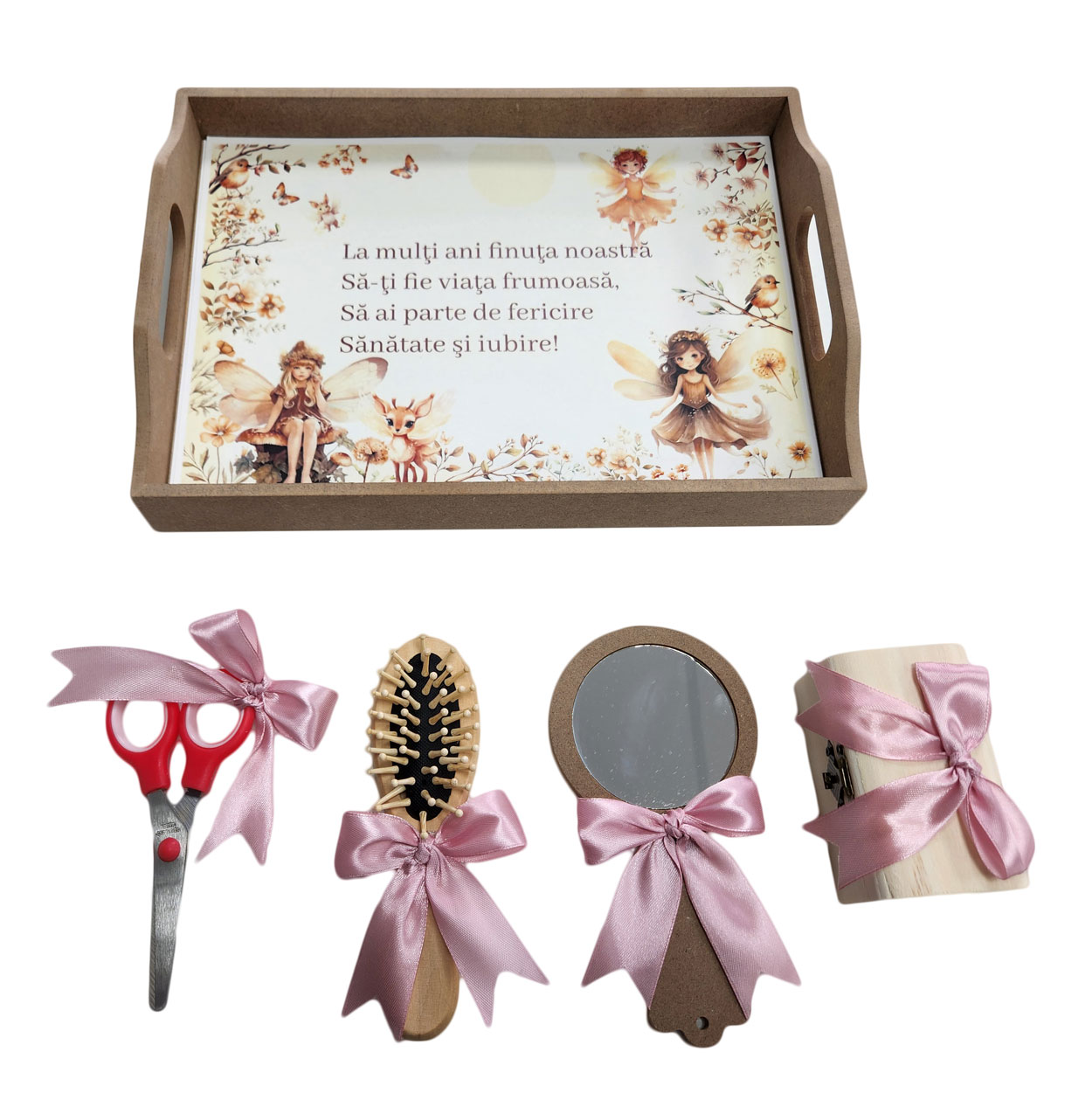 Tava mot fete, set 5 piese, Zane Toamna. Set taiere mot cinci piese, pentru copilul tau. Set din lemn natur pentru copii. Are accesoriile potrivite evenimentului. Setul este format din: tava cu imprimeu viu colorat si cu mesaj, oglinda, perie de par, cutie, foarfec. Toate accesoriile sunt asortate. Tava mot fete, set 5 piese, Zane Toamna poate fi un cadou din partea nasilor la taierea motului.