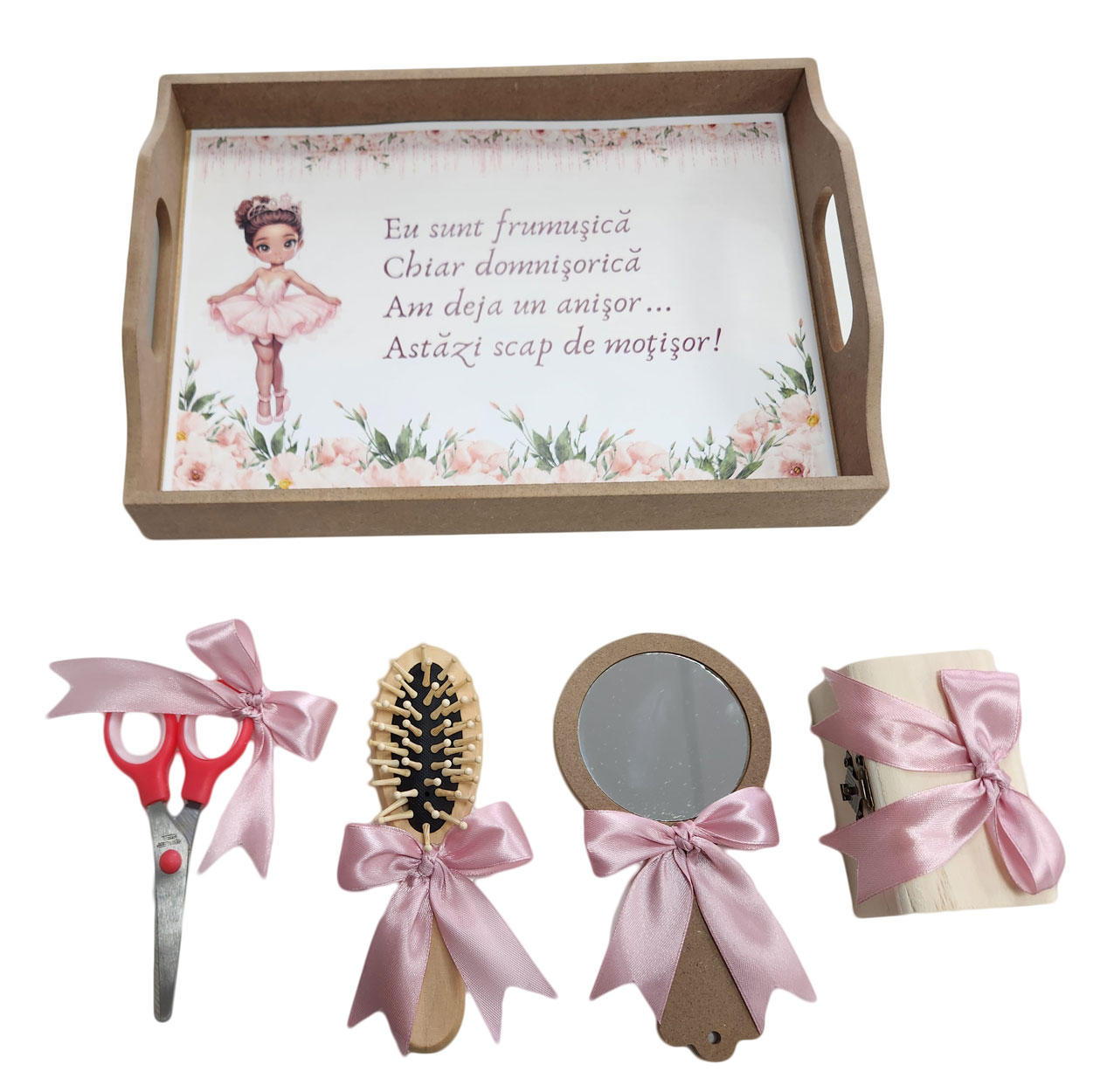 Tavita mot fetite, set 5 piese, Balerina. Set taiere mot cinci piese, pentru copilul tau. Set din lemn natur pentru copii. Are accesoriile potrivite evenimentului. Setul este format din: tava cu imprimeu viu colorat si cu mesaj, oglinda, perie de par, cutie, foarfec. Toate accesoriile sunt asortate. Tavita mot fetite, set 5 piese, Balerina poate fi un cadou din partea nasilor la taierea motului.