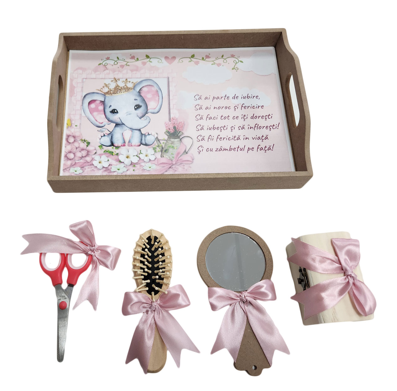 Tavita mot fetite, set 5 piese, Elefantel. Set taiere mot cinci piese, pentru copilul tau. Set din lemn natur pentru copii. Are accesoriile potrivite evenimentului. Setul este format din: tava cu imprimeu viu colorat si cu mesaj, oglinda, perie de par, cutie, foarfec. Toate accesoriile sunt asortate. Tavita mot fetite, set 5 piese, Elefantelpoate fi un cadou din partea nasilor la taierea motului.