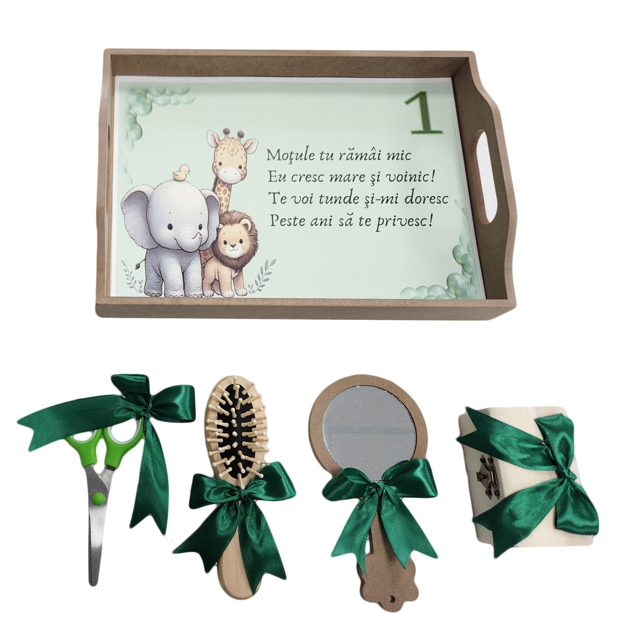 Tavita mot, set 5 piese verzi, Zoo. Set taiere mot cinci piese, pentru copilul tau. Set din lemn natur pentru copii. Are accesoriile potrivite evenimentului. Setul este format din: tava cu imprimeu viu colorat si cu mesaj, oglinda, perie de par, cutie, foarfec. Toate accesoriile sunt asortate. Tavita mot, set 5 piese verzi, Zoo poate fi un cadou din partea nasilor la taierea motului.