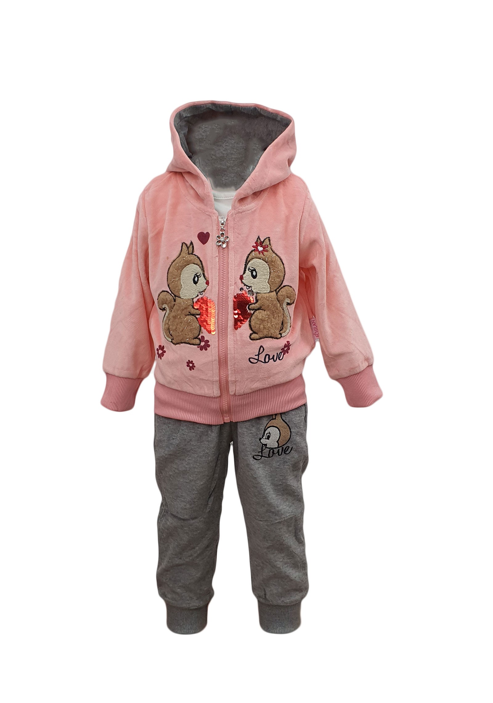 Trening fete, trei piese roz din catifea+bumbac pentru copii. Treningul este un element de imbracaminte din bumbac, format din: bluza trening, tricou cu maneca lunga si pantalon de trening. Este un trening pentru copii din catifea+bumbac, lejer, ce poate fi folosit pentru scoala. Trening pentru copii confortabil.